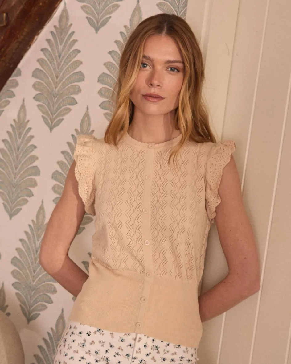Haut beige à texture ajourée, manches courtes à volants et détail élastique à la taille.