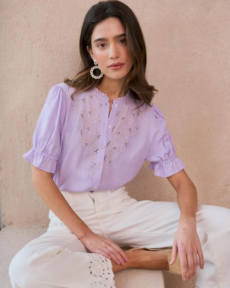 Blouse lilas avec broderie ajourée et manches courtes bouffantes, col classique et fronces aux poignets.