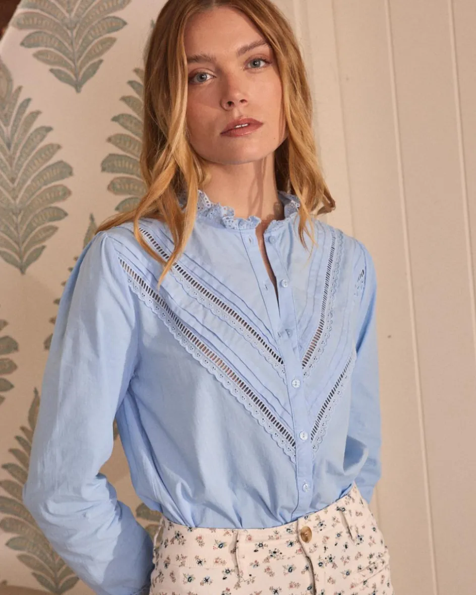 Chemise bleu clair avec broderie avec rangée de boutons et détail de col. Manches longues. Conception légère. Un chemisier idéal à combiner dans la vie de tous les jours.