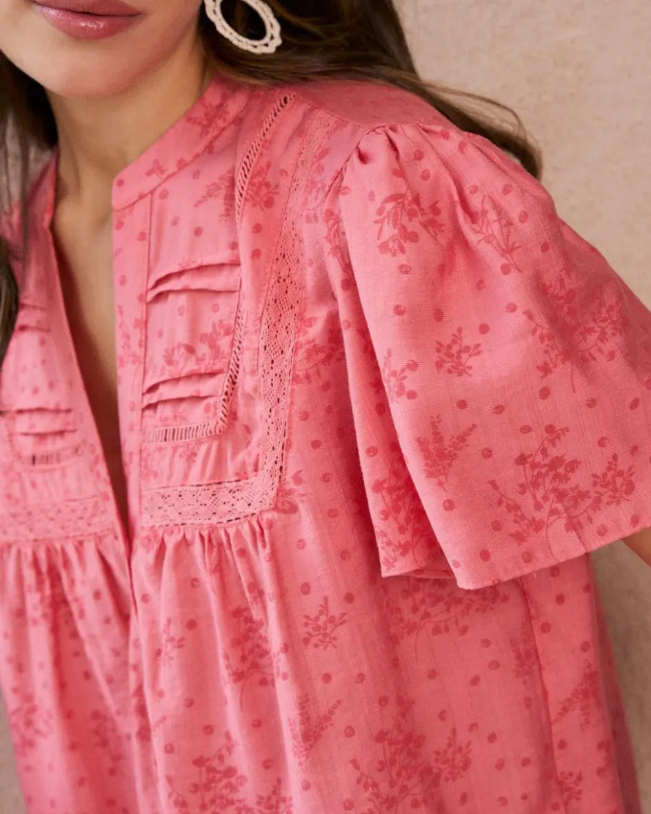 Blouse de couleur corail avec broderies subtiles et manches courtes bouffantes. Son encolure en V et ses détails froncés sur la poitrine ajoutent une touche romantique et féminine.