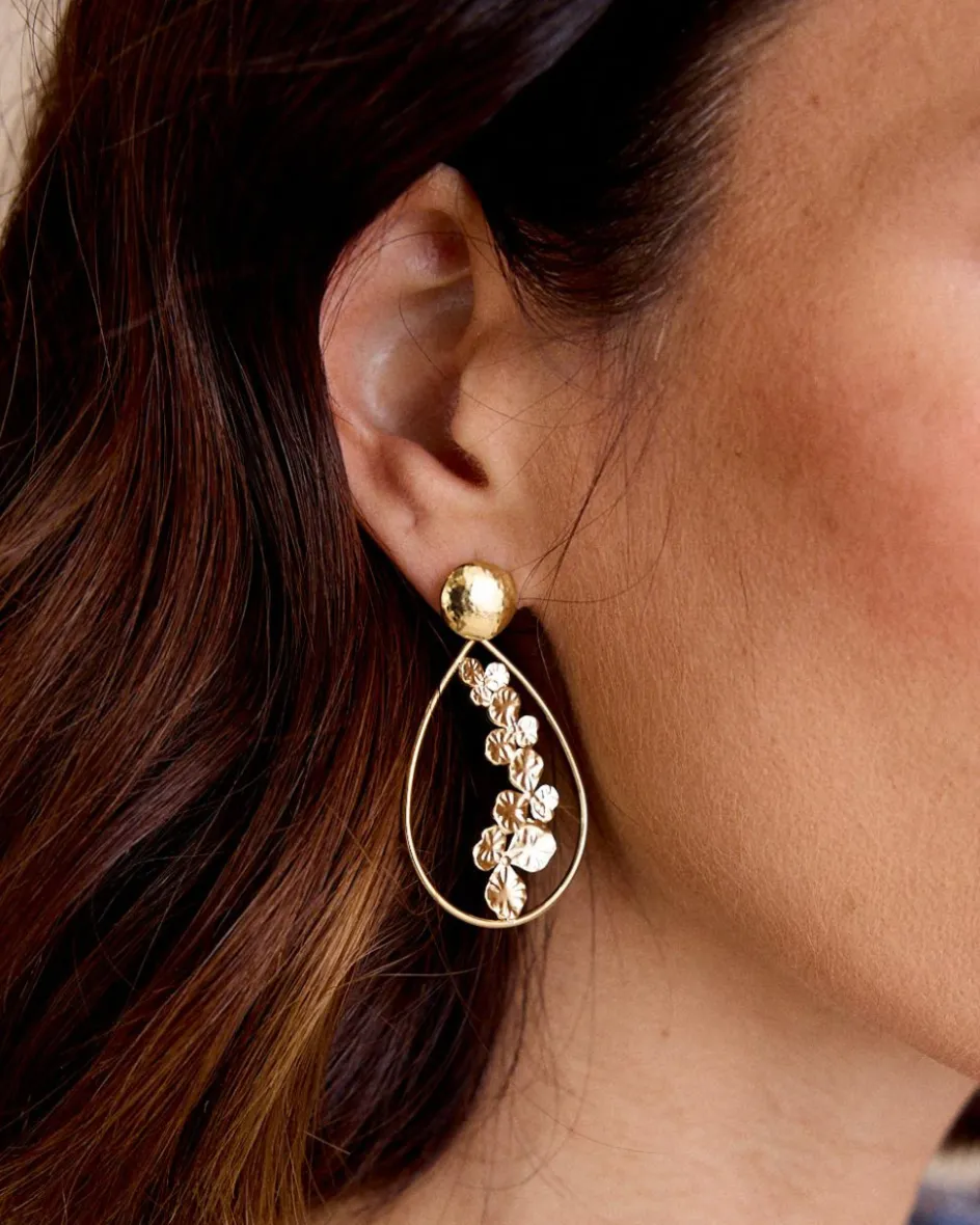 Boucles d’oreilles longues en forme de larme et détails de fleurs dorées en relief. Grande fermeture à boutons sur le haut. Aucun bijou fantaisie ne peut être retourné.