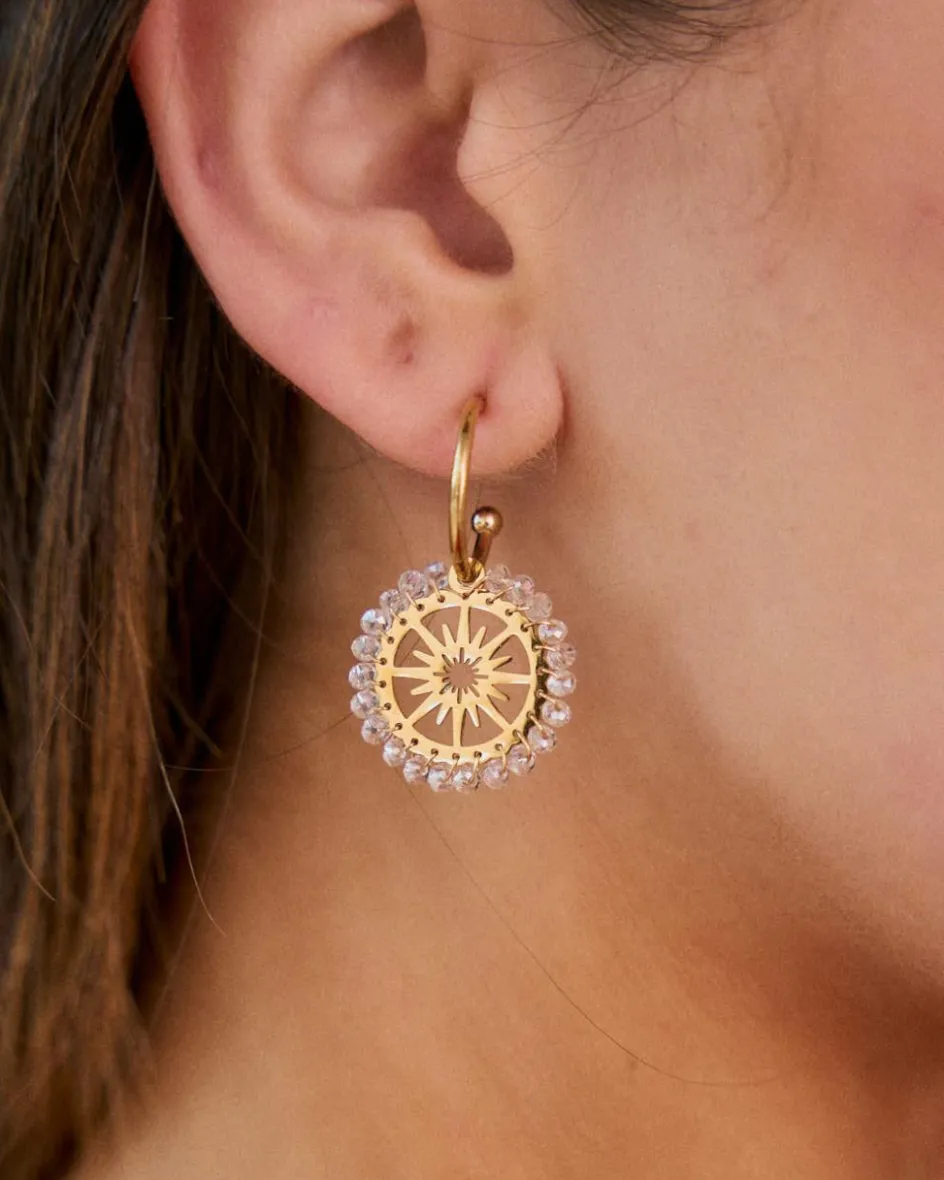 Boucles d’oreilles créoles avec détail central dans les tons blancs et bord doré.