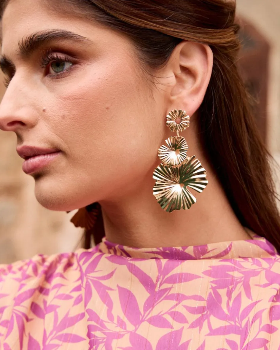 Boucles d’oreilles longues avec des feuilles dorées en design suspendu.