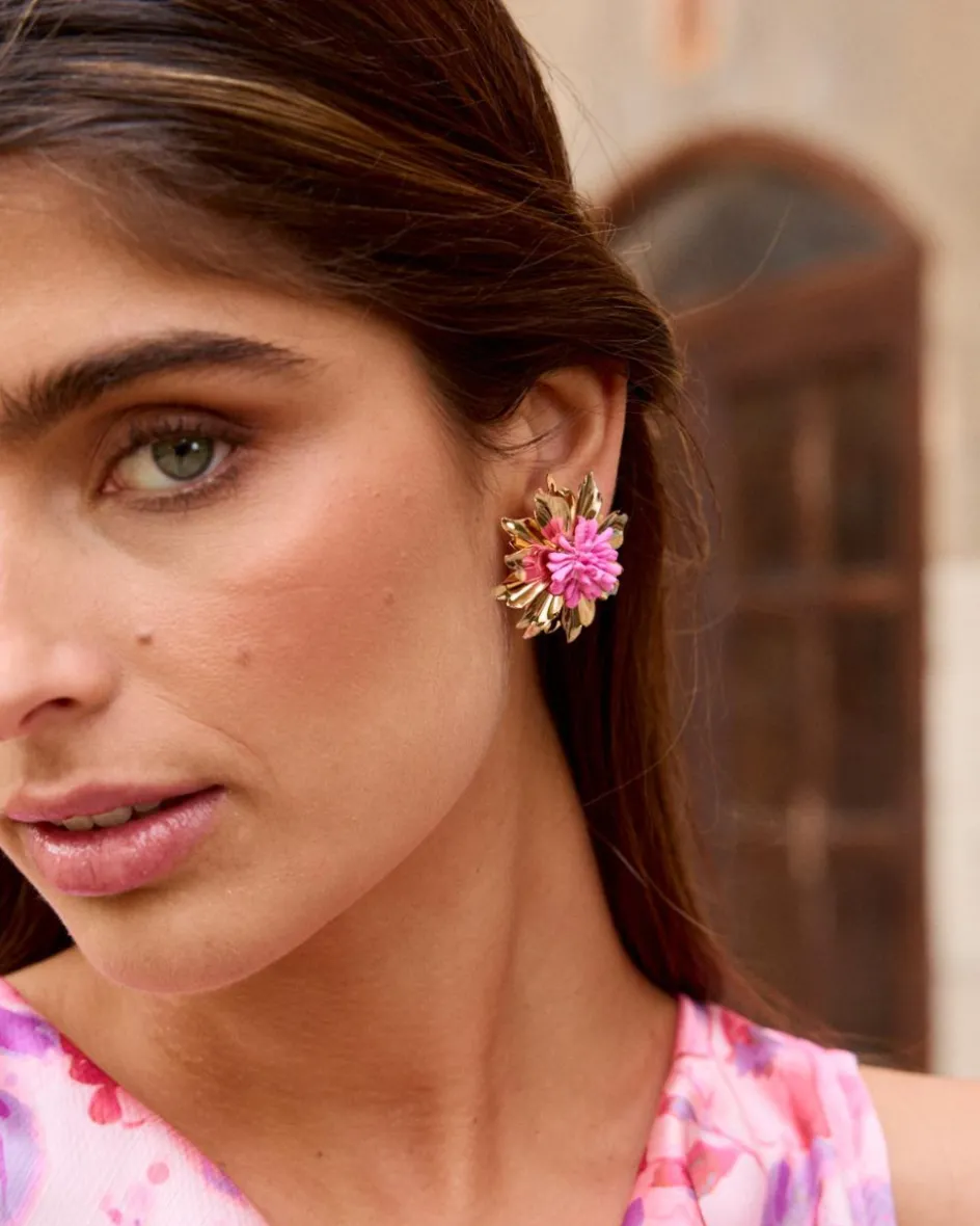 Boucle d’oreille en or avec motif floral dans des tons fuchsia et pétales métalliques.