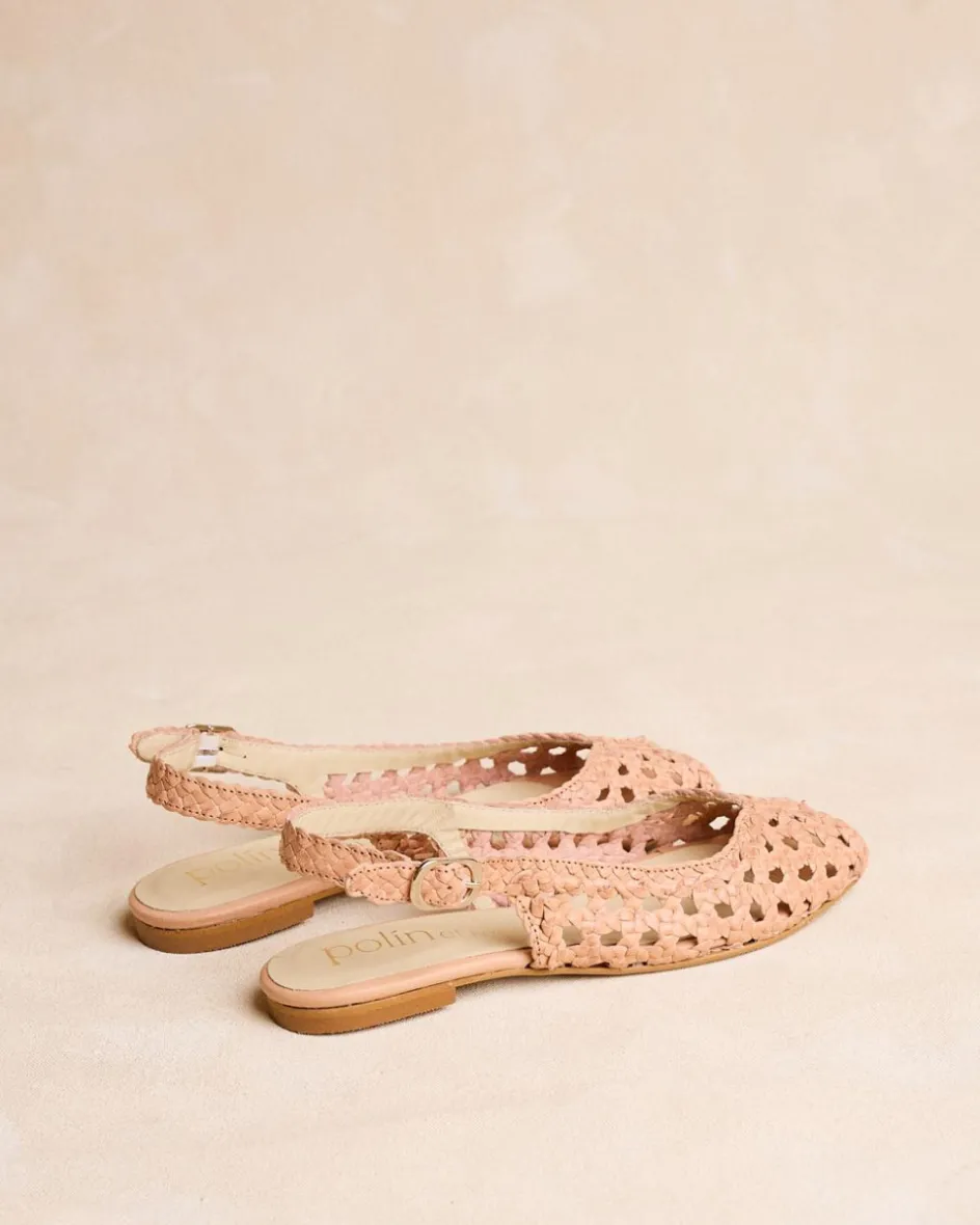 Chaussure plate en cuir tressé de couleur sable. Encolure papillon. Modèle à bride arrière avec bride en cuir tressé avec boucle pour un meilleur ajustement. Une chaussure confortable et très féminine à porter au quotidien.