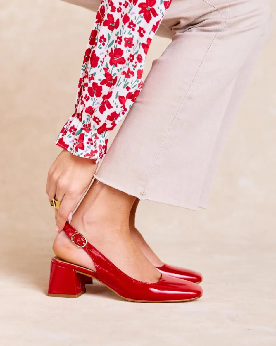 Chaussure à talons rouges à talons. à bout contrasté effet cuir légèrement carré et verni. Encolure arrondie. Une chaussure très féminine et élégante à porter au quotidien.