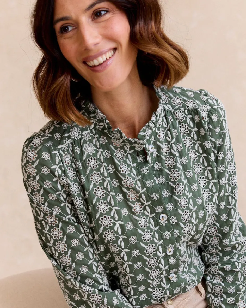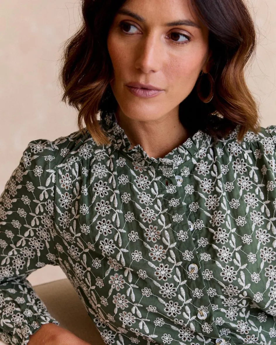 Chemise verte à manches longues avec imprimer fleurie, col rond fermé à volants avec dentelle autour du cou. Corps large et fluide. Une chemise très originale et élégante pour donner une touche spéciale à vos looks.