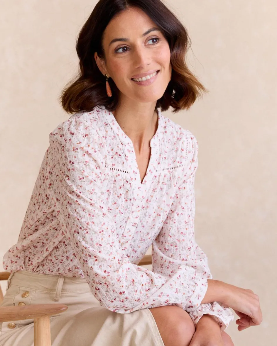Chemise à manches longues de couleur écrue avec imprimer floral, col en V. Corps large et fluide. Une chemise très originale et élégante pour donner une touche spéciale à vos looks.