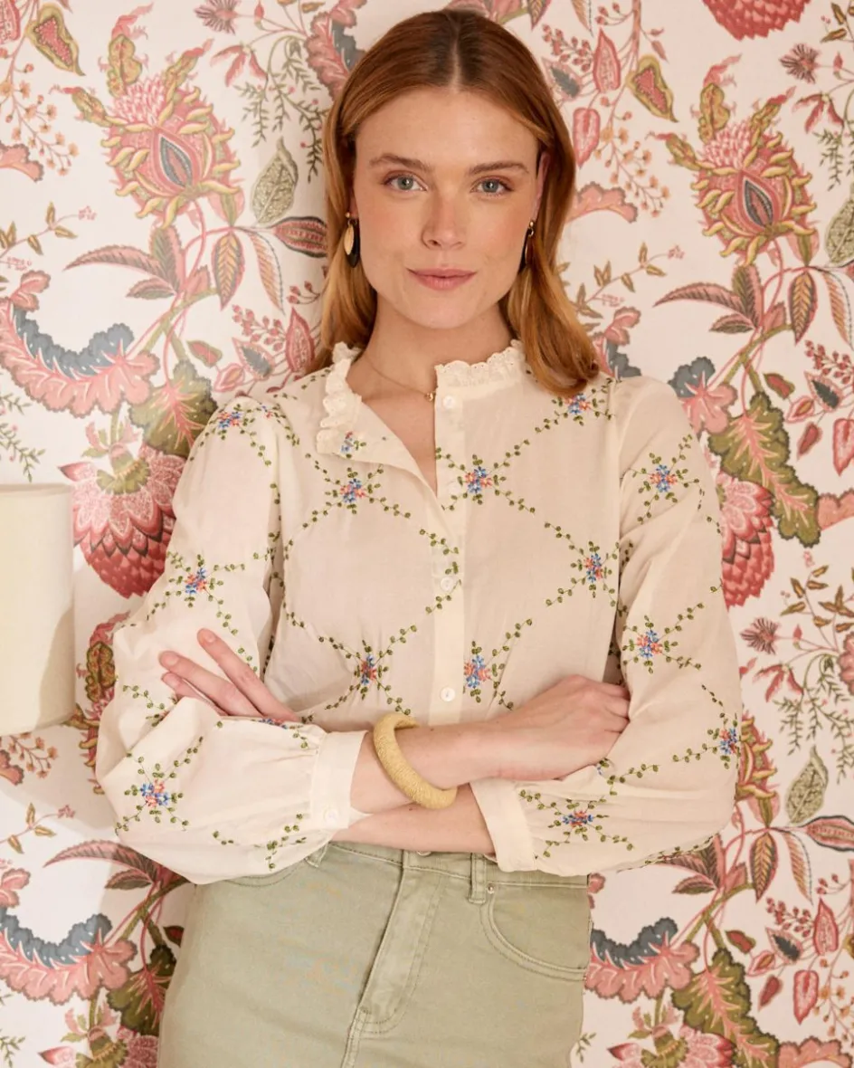 Blouse écrue imprimer ton vert, col à volants subtils, encolure en V et manches longues.