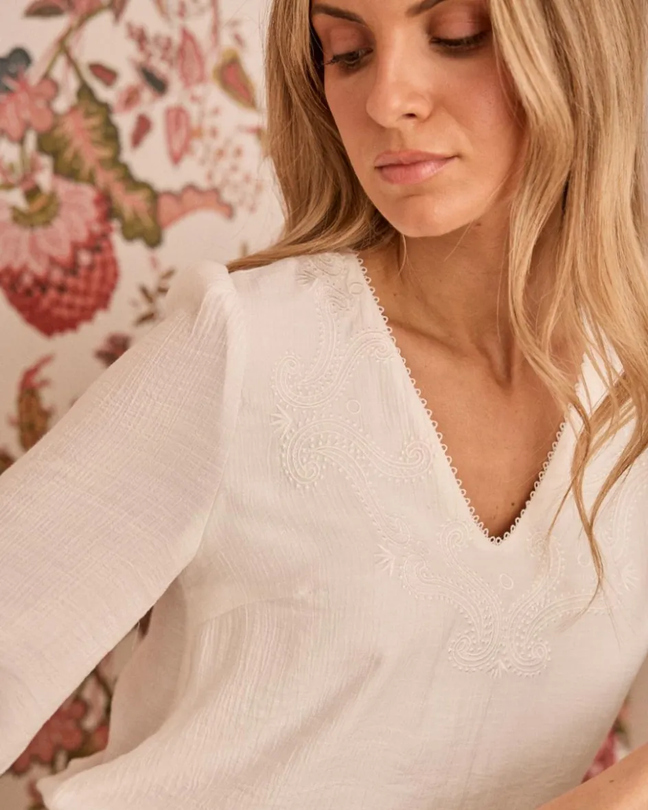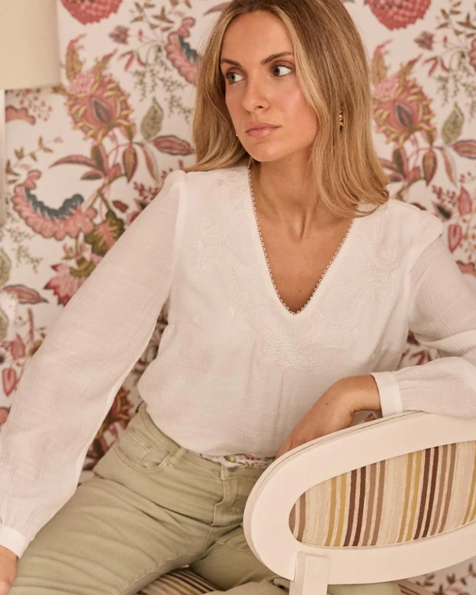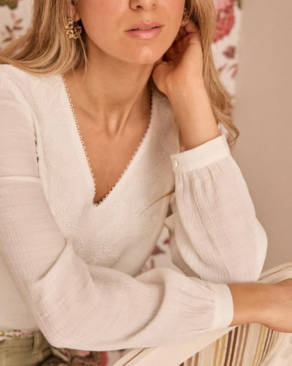 Blouse blanche avec de délicats détails brodés, encolure en V avec bordure subtile, manches longues bouffantes avec poignets réglables