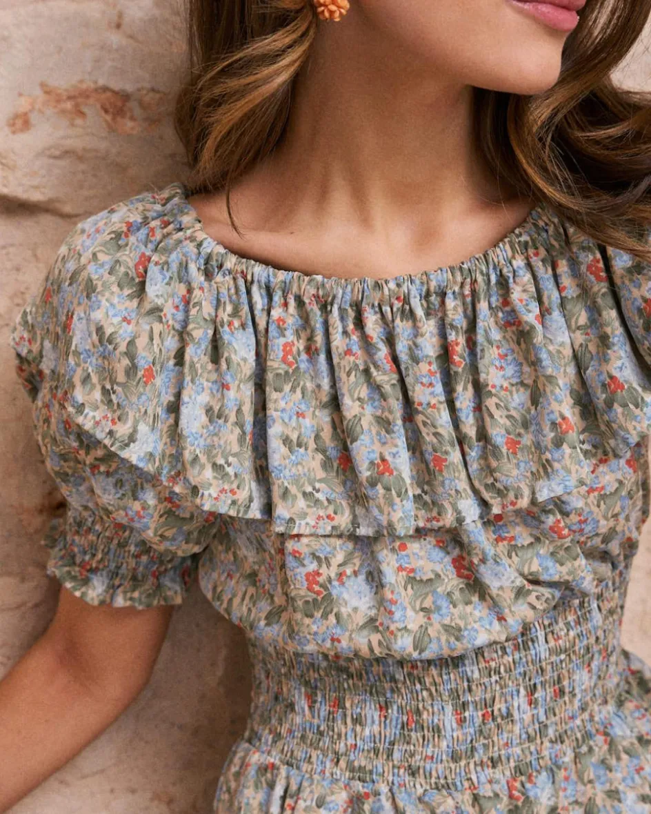 Combinaison bleu indigo avec imprimer floral et décolleté bardot à volants. Sa taille élastique met en valeur la silhouette, tandis que sa coupe fluide apporte confort et mouvement.