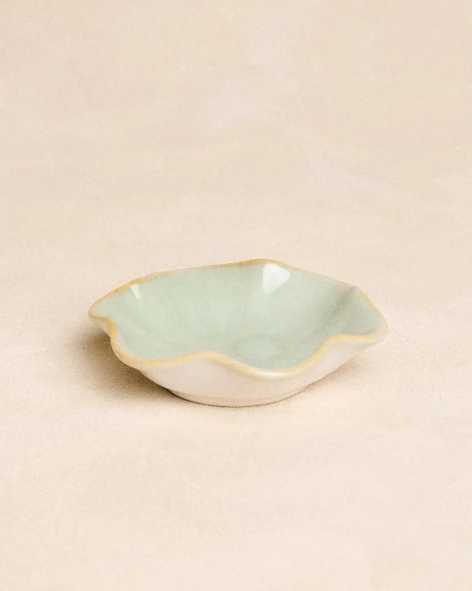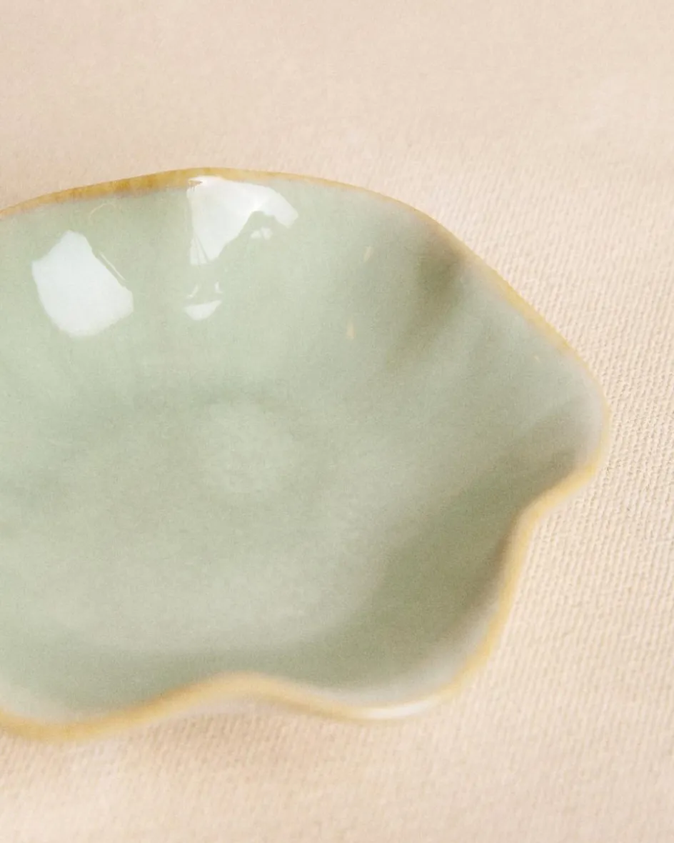 Plateau à bijoux en céramique de couleur menthe avec bord doré, design élégant et taille idéale pour les bagues, les bracelets et les petits accessoires.