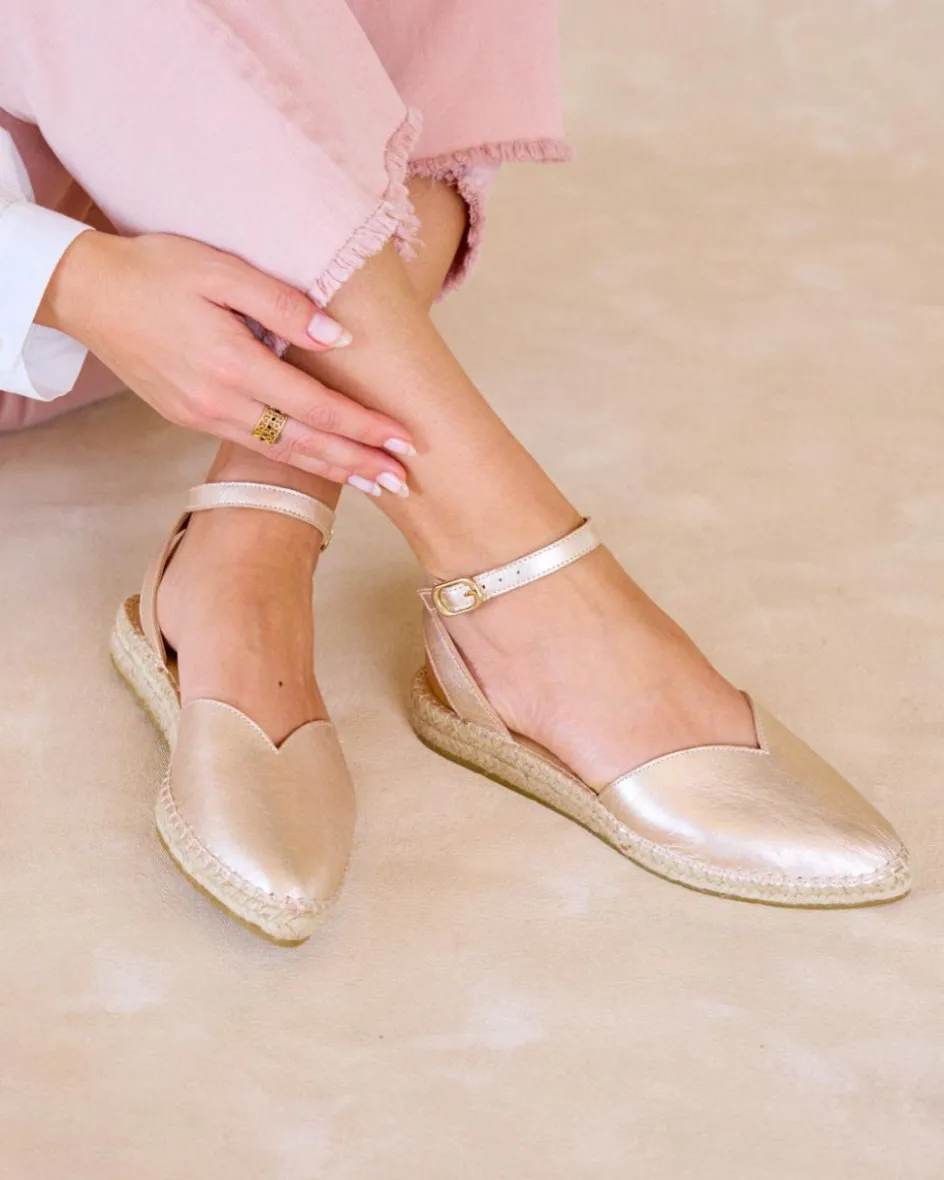 Espadrille de couleur argentée avec bride de cheville réglable. Design léger, confortable et polyvalent pour les looks d’été.