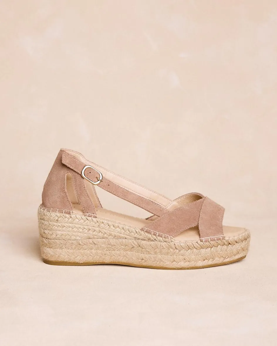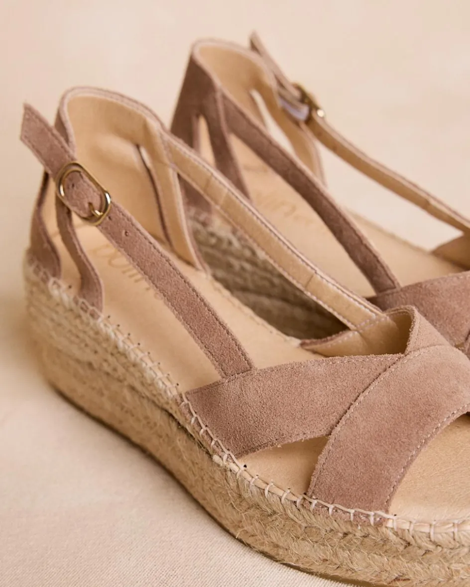 Espadrilles de couleur taupe avec coin en jute et motif portefeuille sur la tige. Ils ont des brides de cheville réglables qui offrent soutien et style, idéales pour des looks confortables et estivaux.
