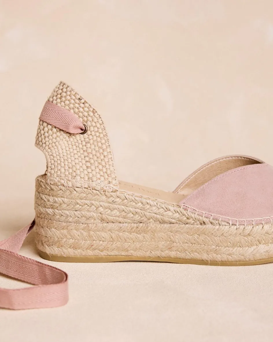 Espadrilles à rubans nude, avec bout fermé et lien à la cheville.