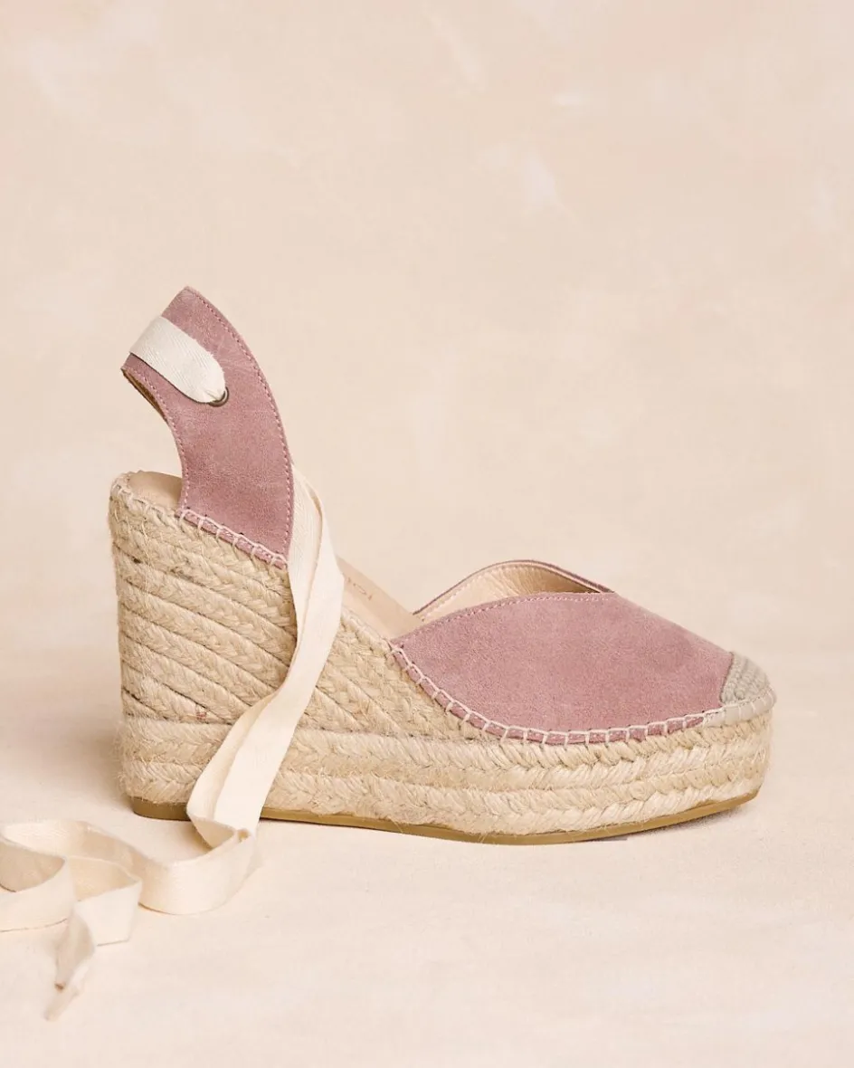 Espadrille en cuir à bride arrière de couleur taupe, encolure en cœur sur le devant, fermeture par bracelet croisé et boucle à la cheville. Fabrication espagnole de jute naturel.