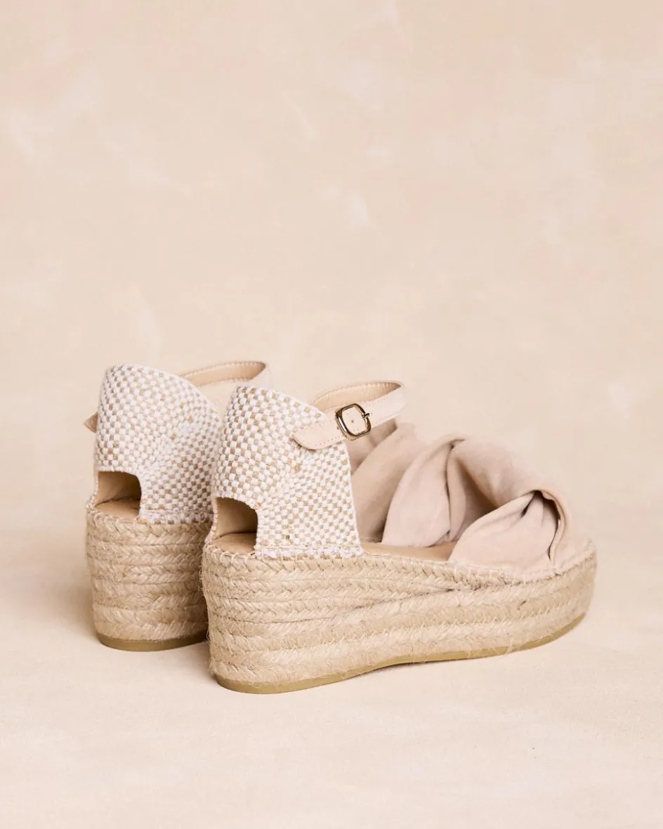 Espadrilles de couleur sable avec talon compensé en jute et nœud sur la tige. Leur conception avec une bride de cheville réglable en fait la chaussure idéale pour un look féminin et stylisé.