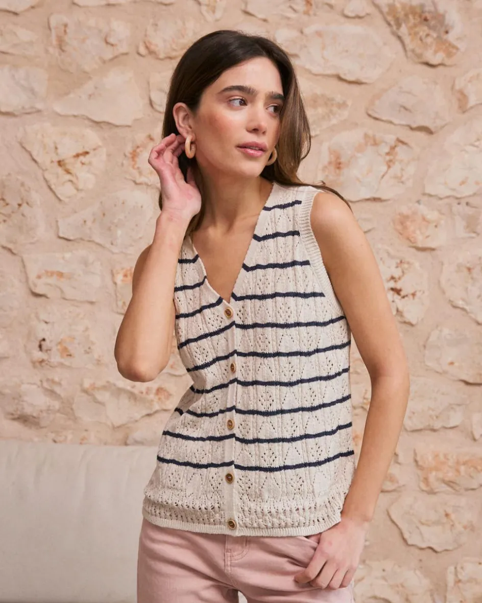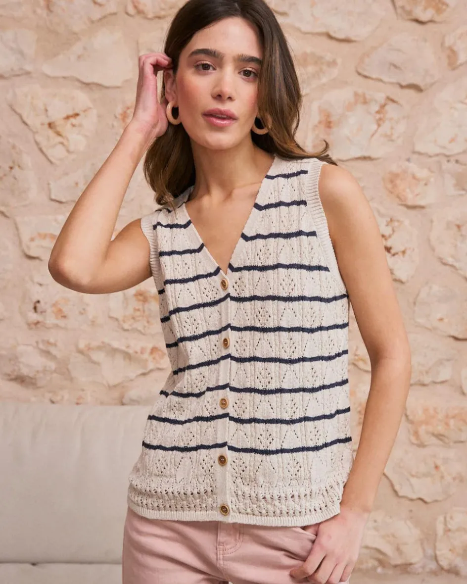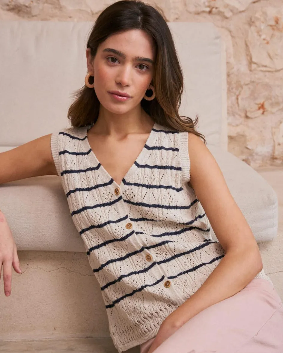 Gilet en maille beige à rayures bleues. Modèle sans manches, encolure en V et fermeture boutonnée sur le devant.