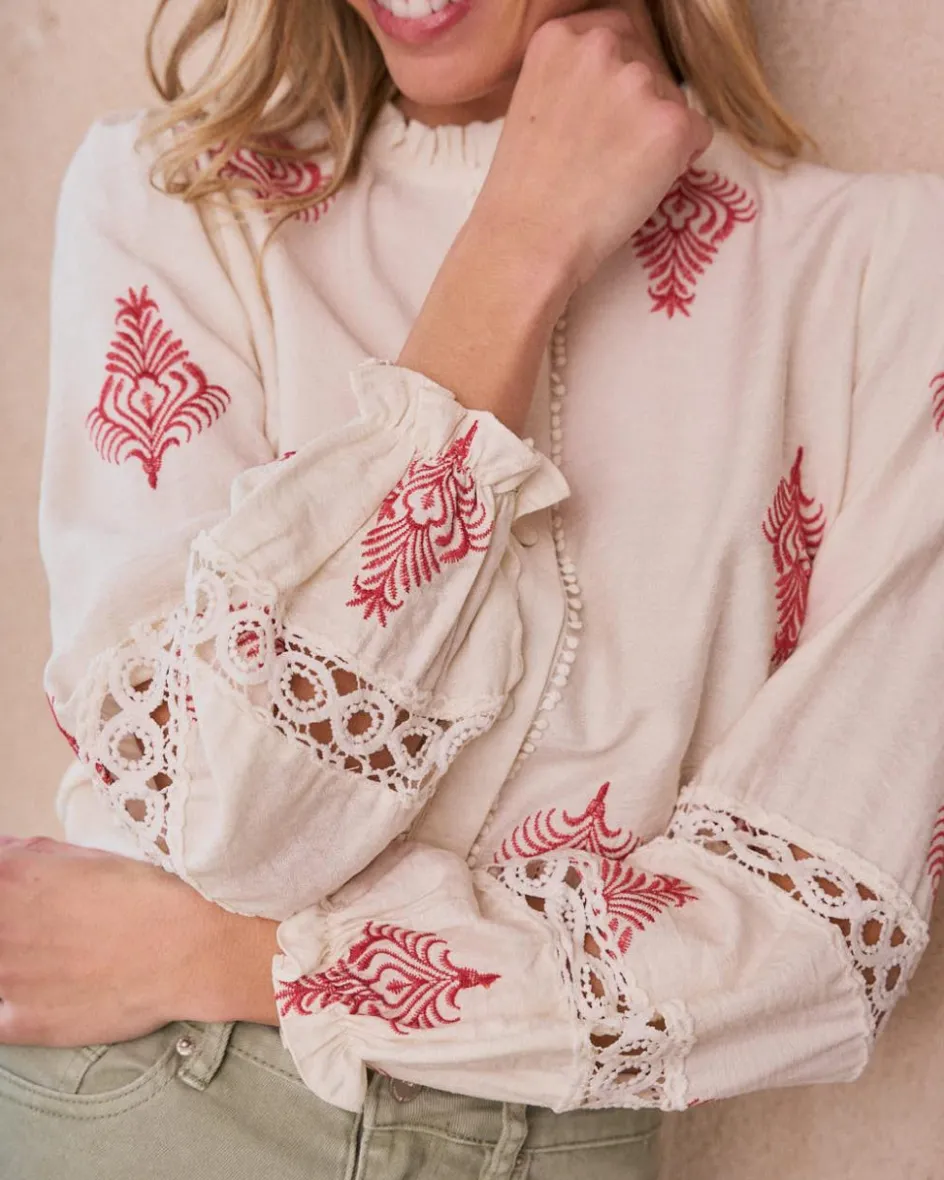 Chemise dans des tons bruts avec broderie rouge. Modèle à manches longues avec des détails ajourés sur les poignets, un col à volants subtil et des boutons sur le devant.