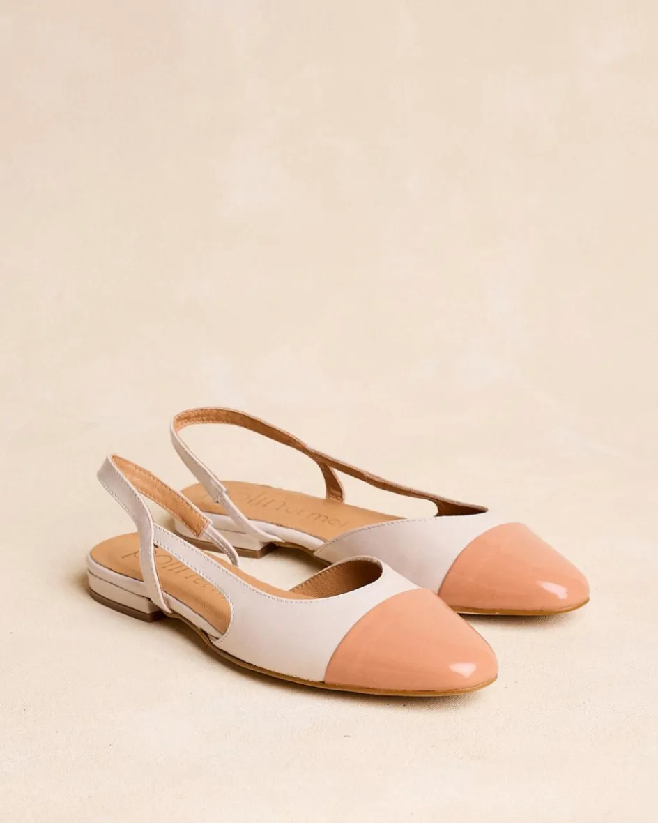 Ballerines cuir à bride arrière bicolore dans les tons nude. Bout légèrement pointu en cuir camel. Bride au talon. C’est une chaussure différente et confortable à combiner avec des pantalons et des robes.