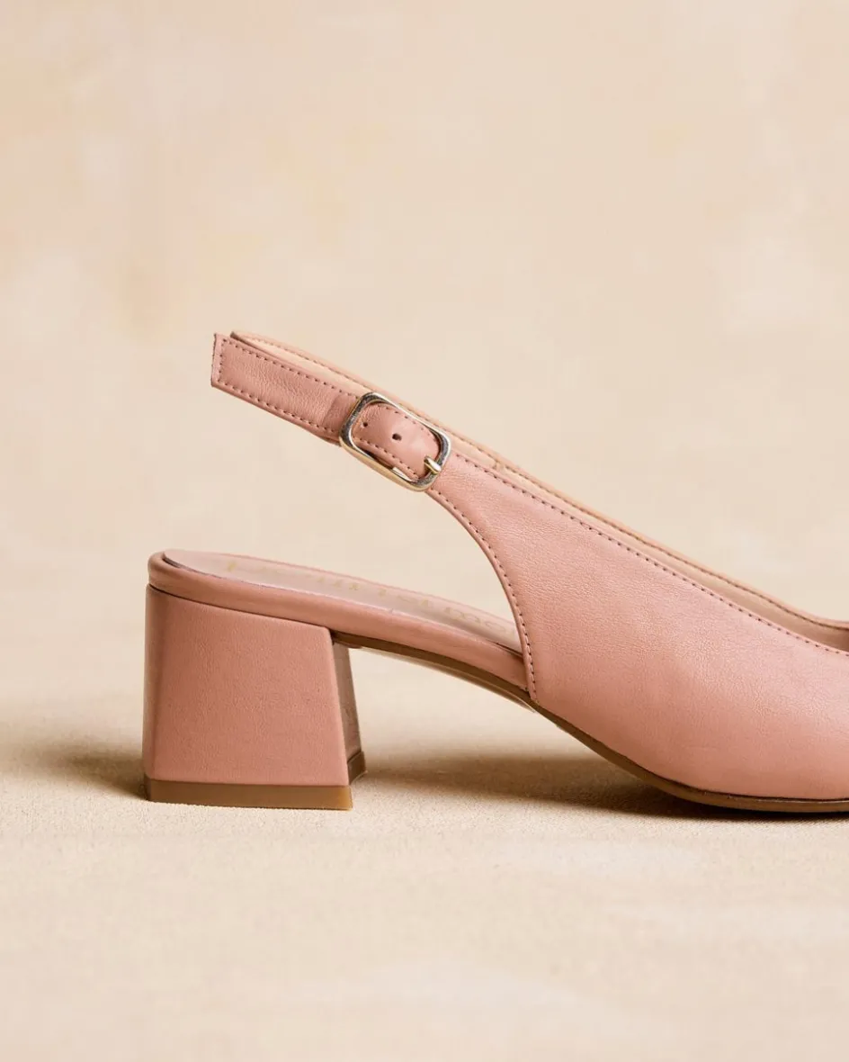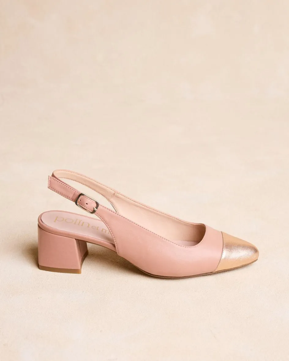 Chaussure à bride arrière en cuir rose. Bout pointu dans un ton doré. Bride au talon. Talon carré.