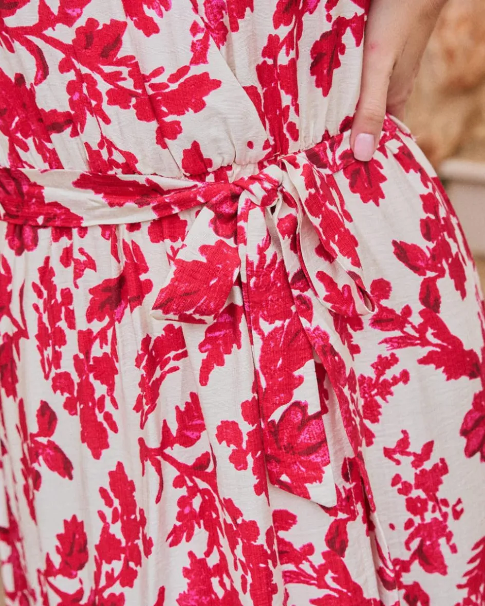 Robe longue framboise avec imprimer floral, encolure en V, manches courtes larges et ceinture ajustable