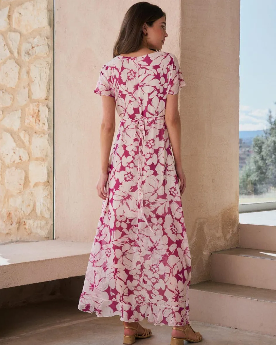 Robe longue à imprimer fleuris dans les tons roses sur fond blanc. Il présente une encolure en V, des manches courtes et un design croisé avec une fente dans la jupe, ce qui ajoute une touche élégante et féminine.