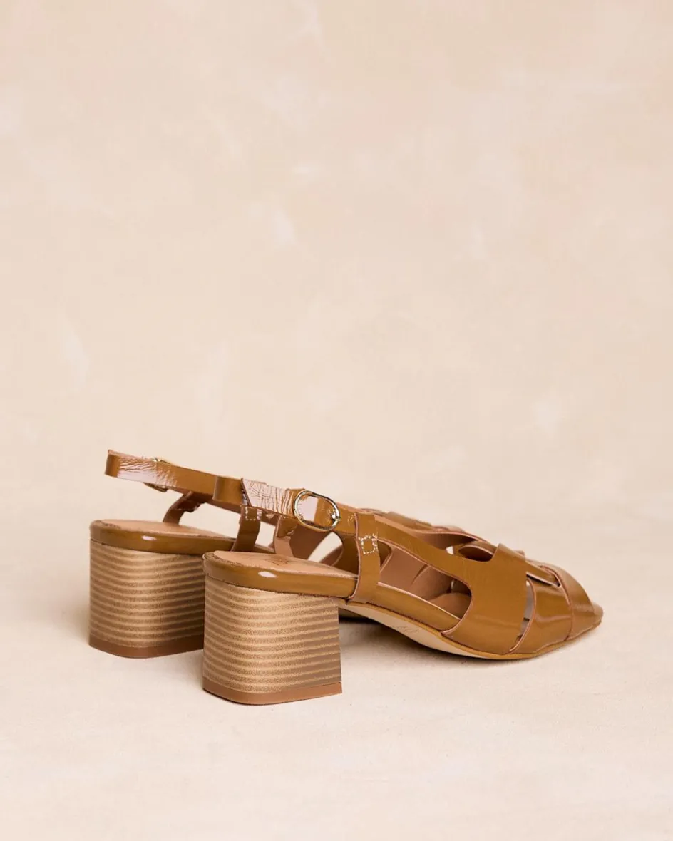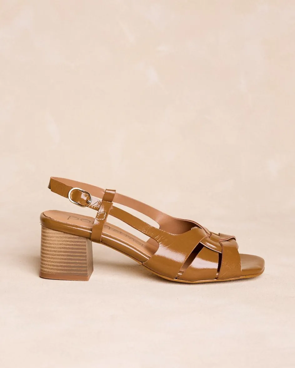 Sandales couleur cuir avec brides croisées et talon moyen large. Il est doté d’une fermeture à boucle à la cheville qui assure maintien et confort, parfaite pour un look décontracté avec une touche élégante.