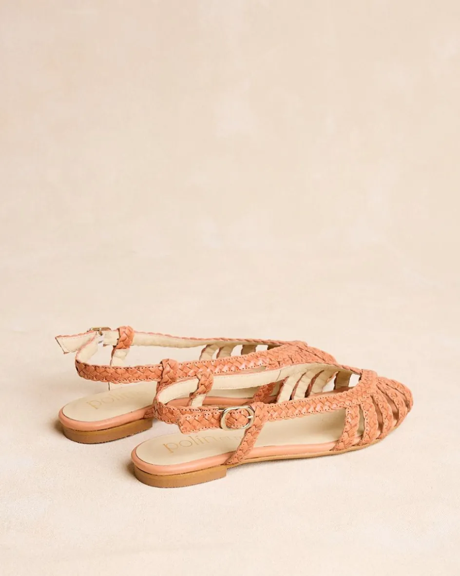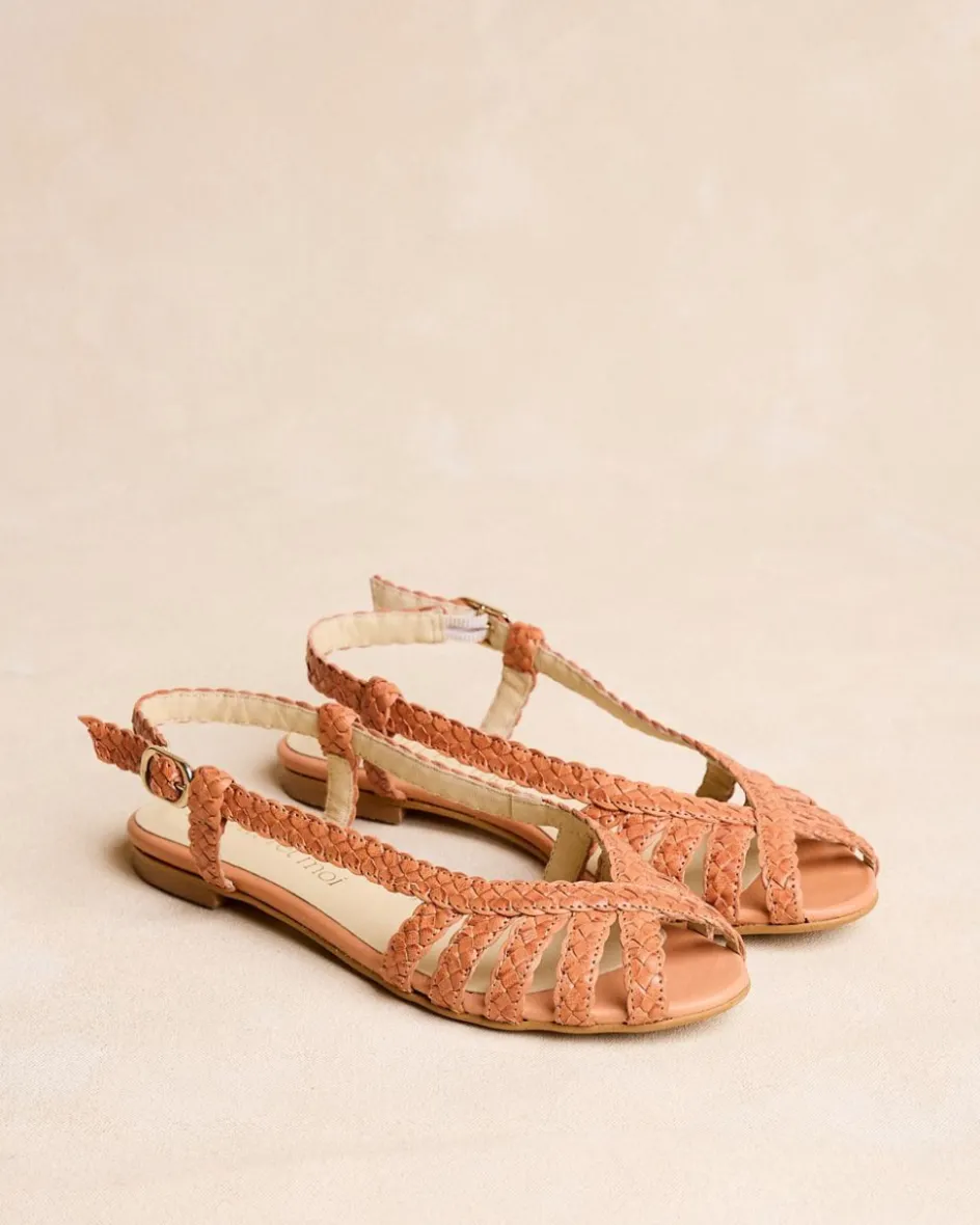 Sandale plate en cuir tressé orange. Bout ouvert et pointu. Ouvertures sur le cou-de-pied avec lanières en cuir tressé. Support de cheville avec fines sangles à boucle. La semelle intérieure est dotée d’un coussinet pour plus de confort. Une sandale pour rehausser n’importe quel look cette saison.