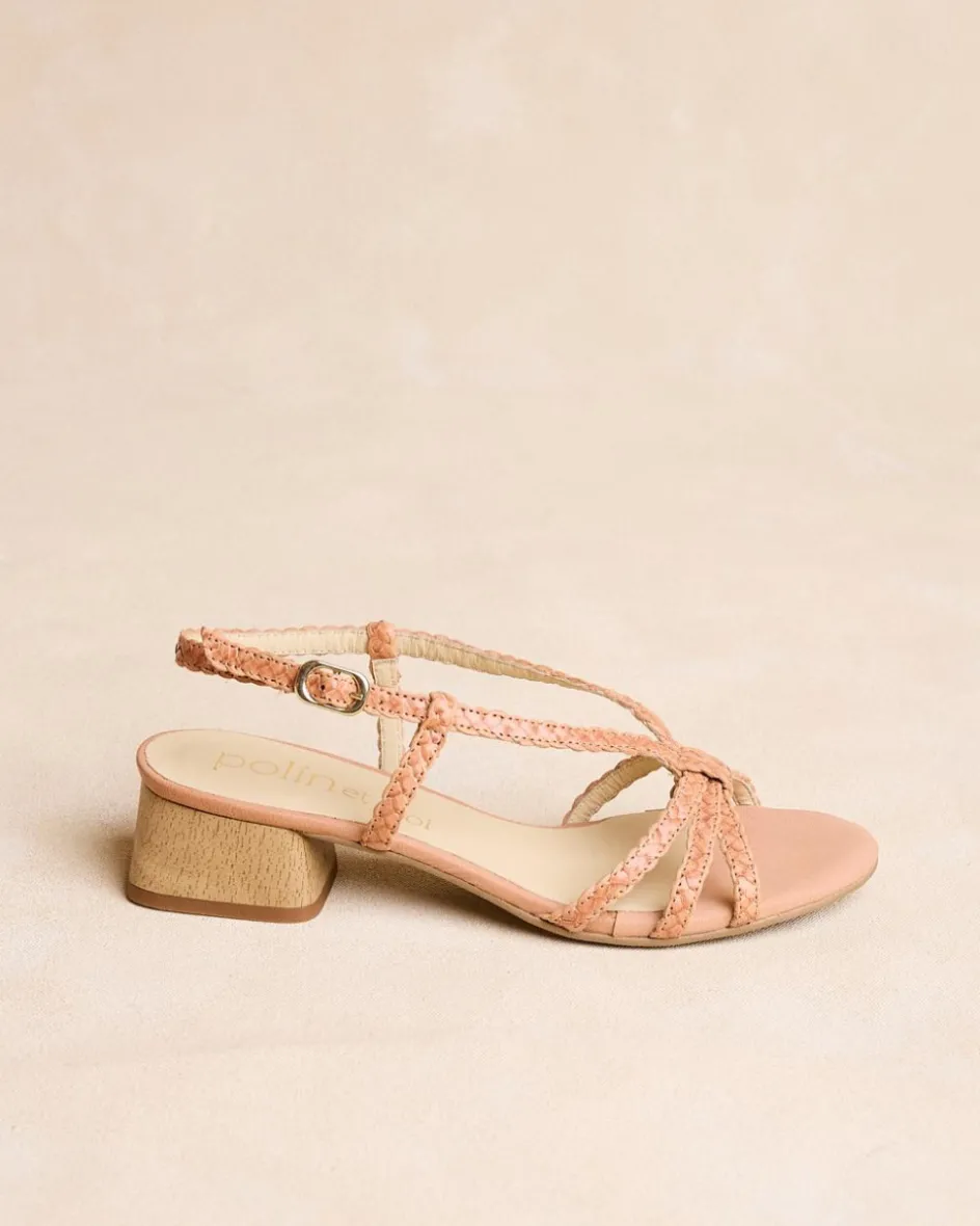 Sandale à talon tressé en cuir camel. Tige en ruban triple tressé avec détail de nœud au centre. Talon fermé par une bride en cuir avec boucle pour un meilleur ajustement. Petit talon carré effet bois. Une sandale confortable et très polyvalente à porter au quotidien.