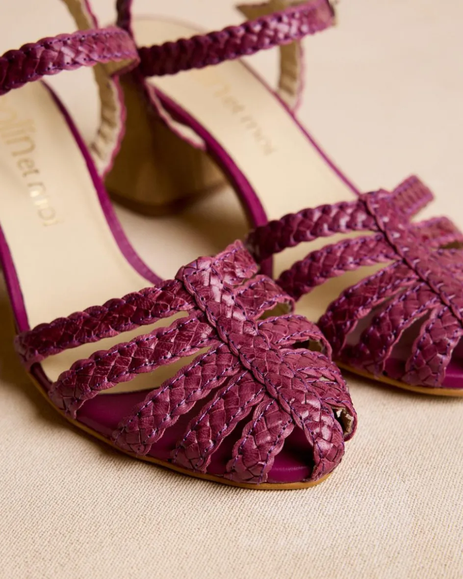 Sandale en cuir tressé violet. Bout arrondi avec détail de ruban tressé croisé. Talon fermé par une bride en cuir. Cheville avec rendez-vous avec boucle pour un meilleur ajustement. Talon carré en bois. Une sandale très spéciale et élégante pour cette saison.
