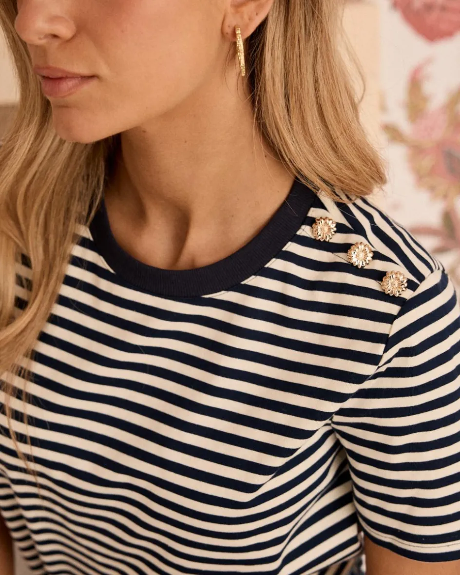 T-shirt bleu marine à rayures horizontales, manches courtes, boutons dorés et col rond.