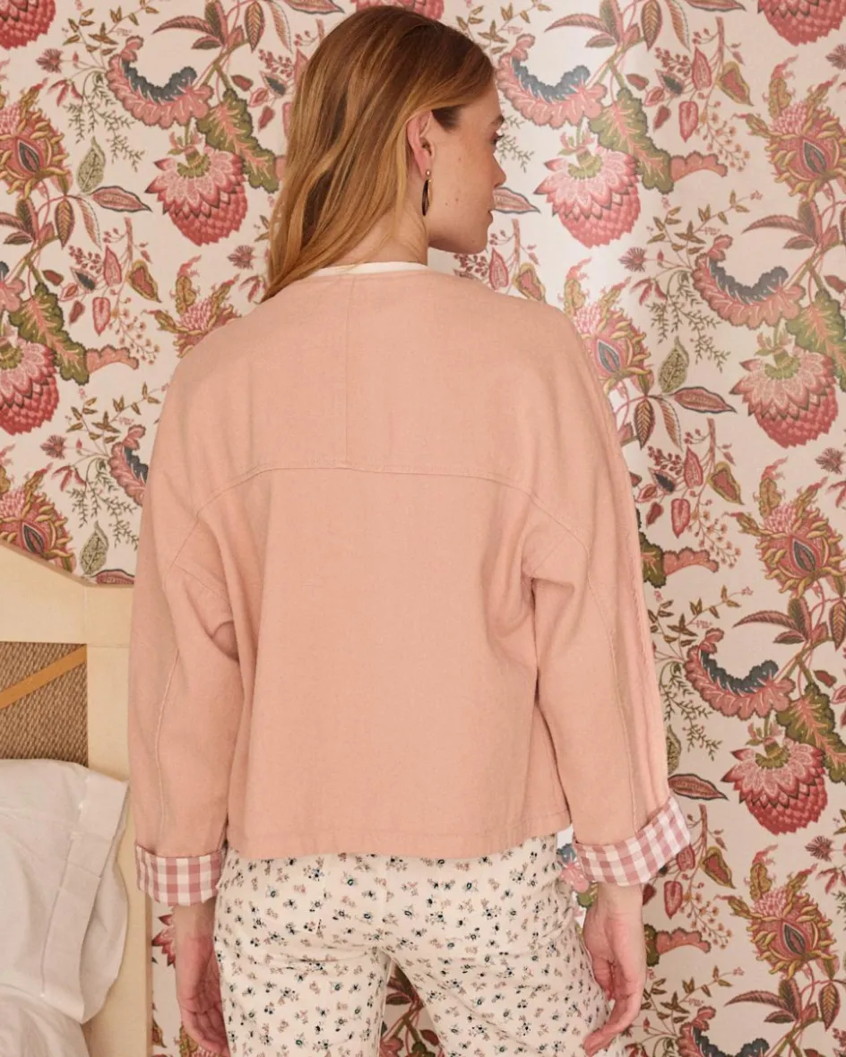 Veste en jean rose avec poches, manches avec doublure en imprimer vichy et fermetures boutonnées