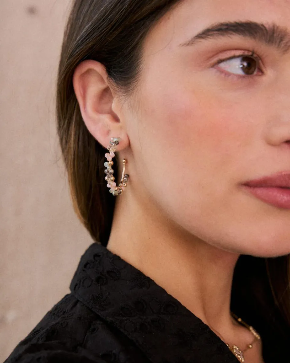 Boucles d’oreilles créoles en or avec des détails délicats de pierres multicolores.