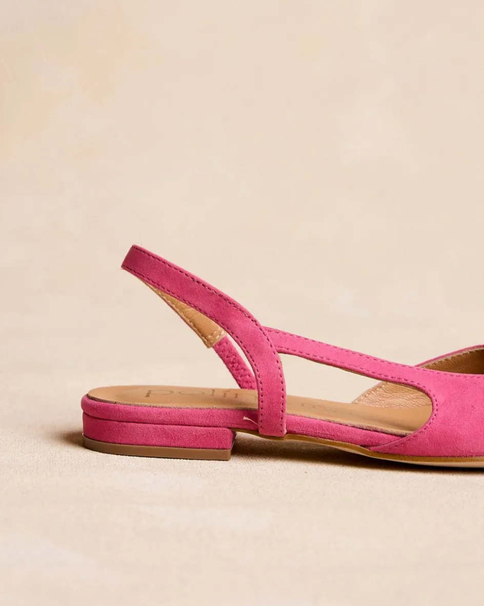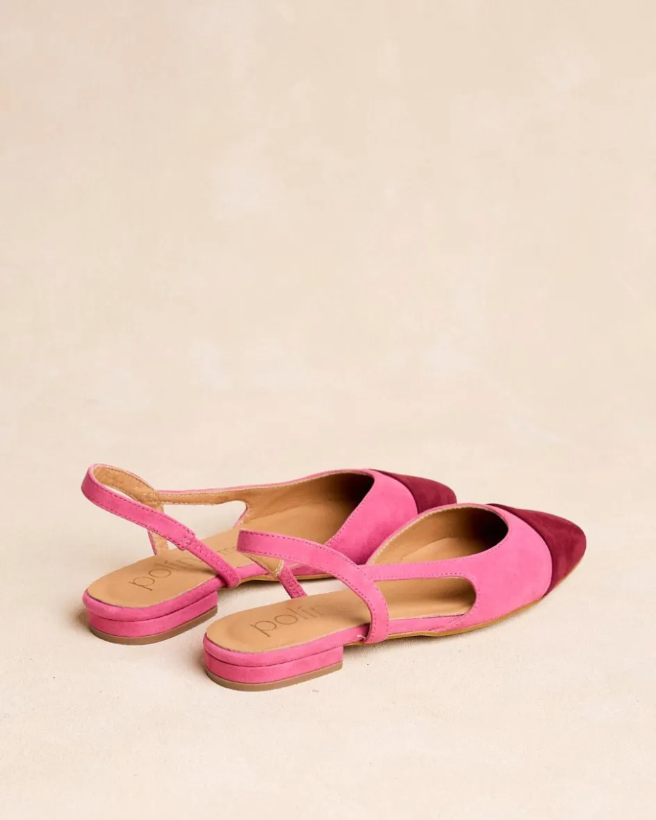 Ballerines cuir à bride arrière bicolore dans les tons roses. Bout légèrement pointu dans bordeaux ton. Bride au talon. C’est une chaussure différente et confortable à combiner avec des pantalons et des robes.