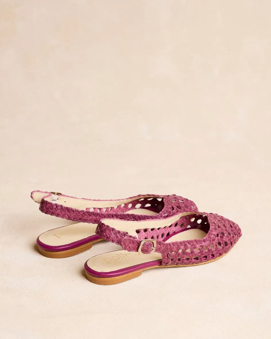 Chaussure plate en cuir tressé de couleur bougainvilliers. Modèle à bride arrière avec bride en cuir tressé avec boucle pour un meilleur ajustement. Une chaussure confortable et très féminine à porter au quotidien.