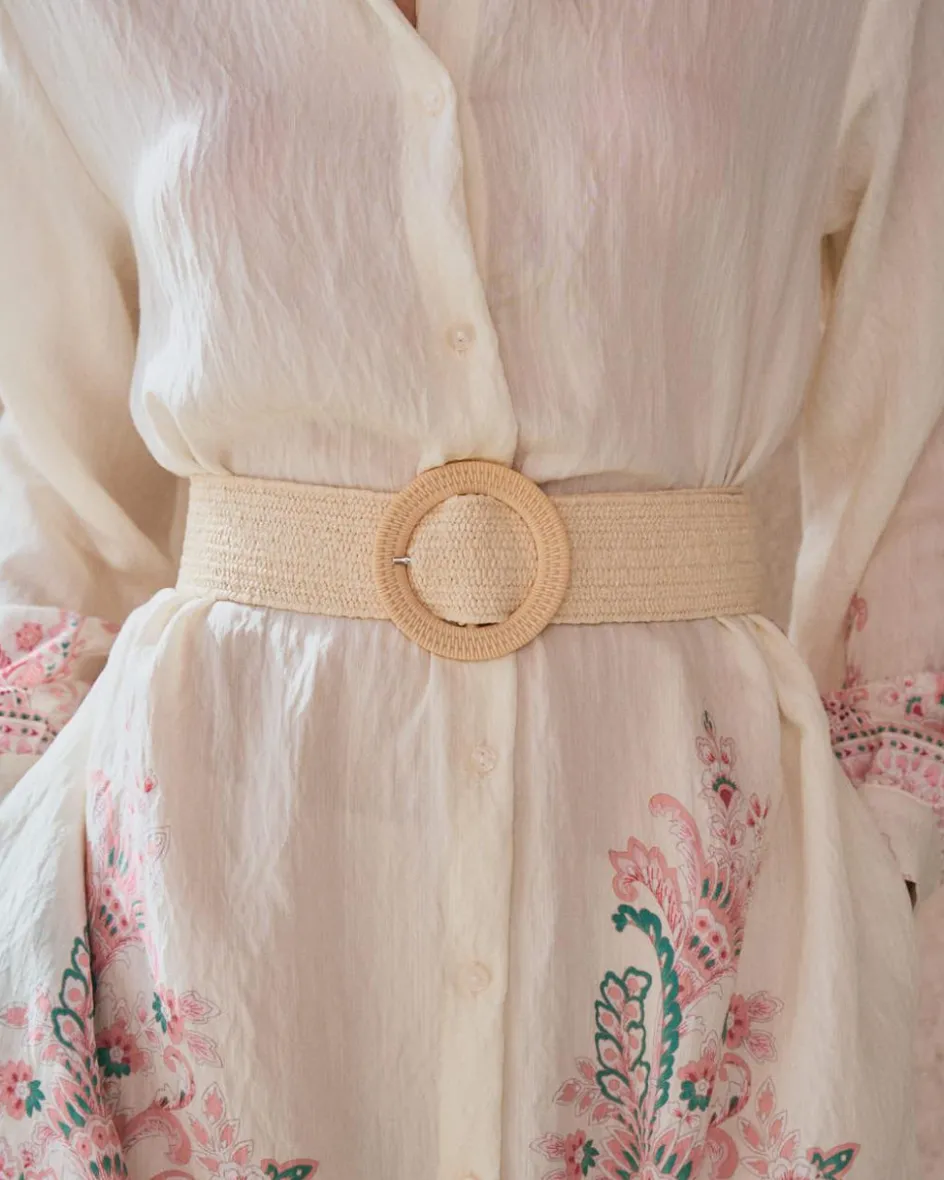 Ceinture élastique avec boucle circulaire en bois de couleur sable.