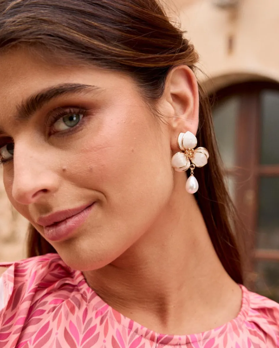 Boucles d’oreilles blanches avec motif de perles réunies en forme de croix et de pendentif.