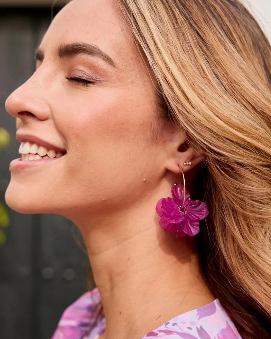 Boucles d’oreilles avec créole dorée et une délicate fleur violette.