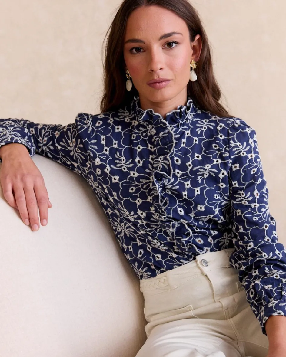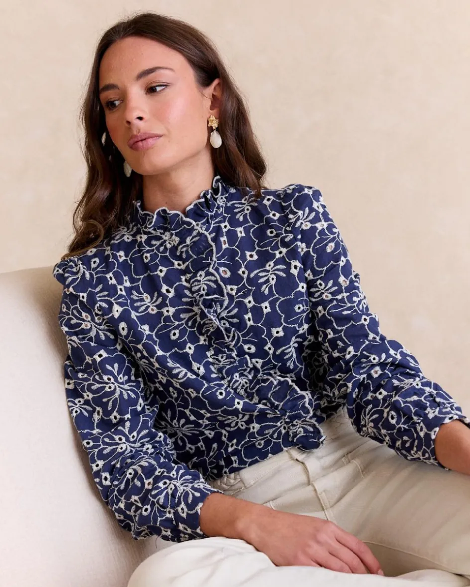 Blouse en jean avec broderie florale contrastée, design romantique avec col roulé à volants. Il a des manches longues et une fermeture boutonnée sur le devant, idéale pour un look frais et original.