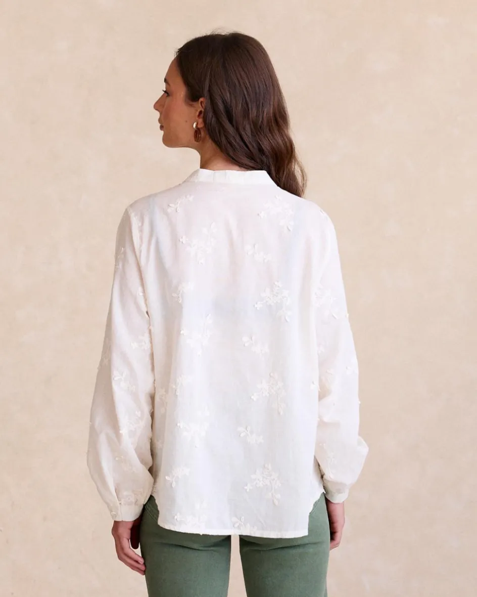 Blouse écrue avec de délicates broderies florales et des détails en dentelle sur la poitrine. Il est doté d’un col rond, d’une fermeture boutonnée sur le devant et de manches longues, idéales pour un style romantique et léger.