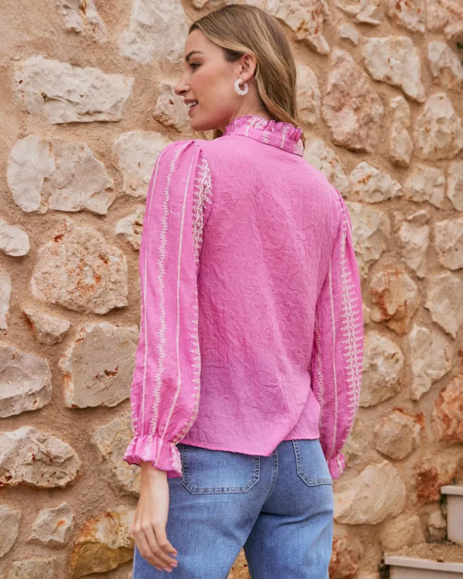 Blouse rose vif avec détails brodés blancs, manches longues et col roulé à volants. Le design boutonné sur le devant lui donne une touche élégante et sophistiquée.
