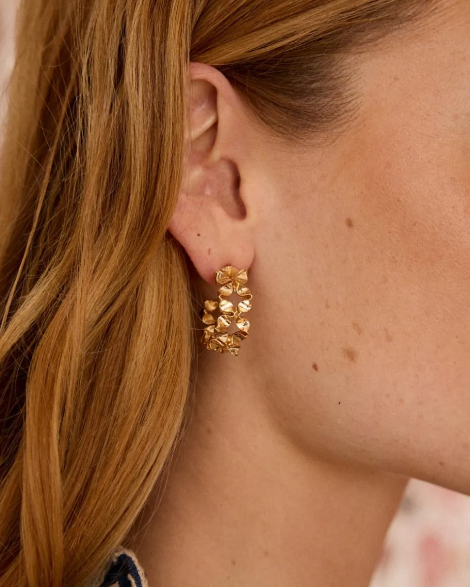 Large boucle d’oreille créole de couleur or avec détails floraux.