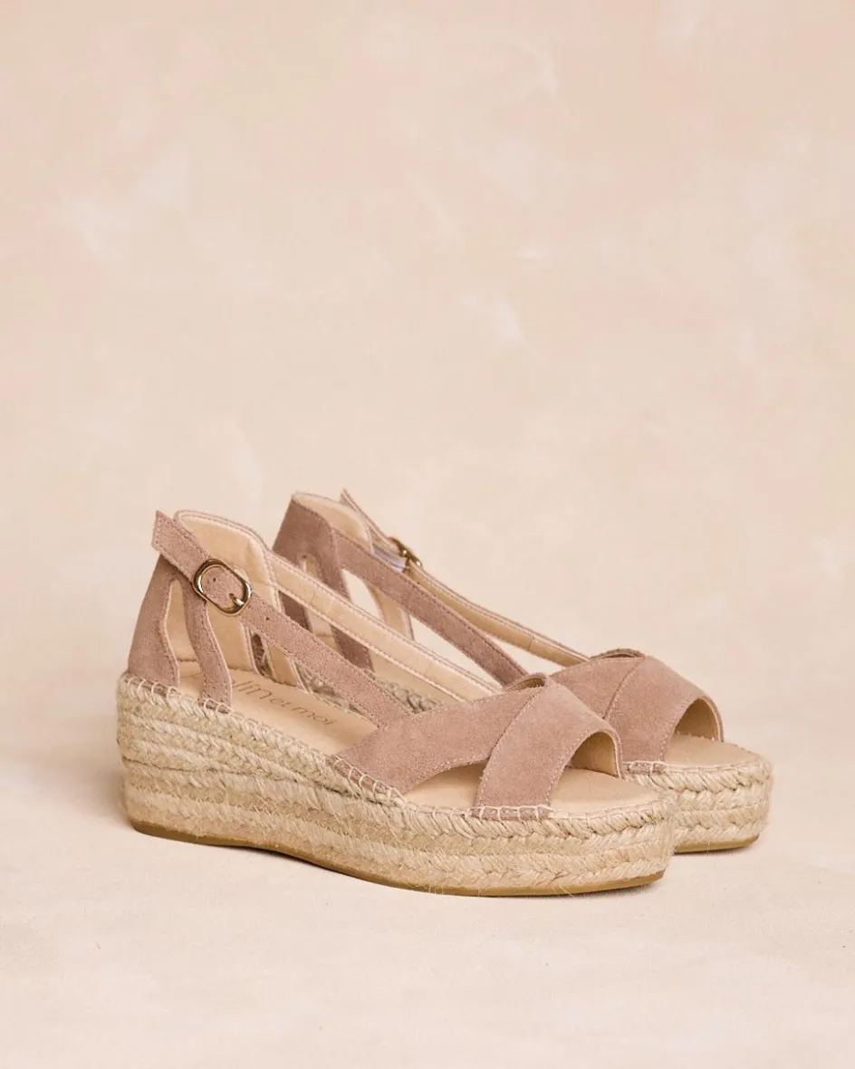 Espadrilles de couleur taupe avec coin en jute et motif portefeuille sur la tige. Ils ont des brides de cheville réglables qui offrent soutien et style, idéales pour des looks confortables et estivaux.