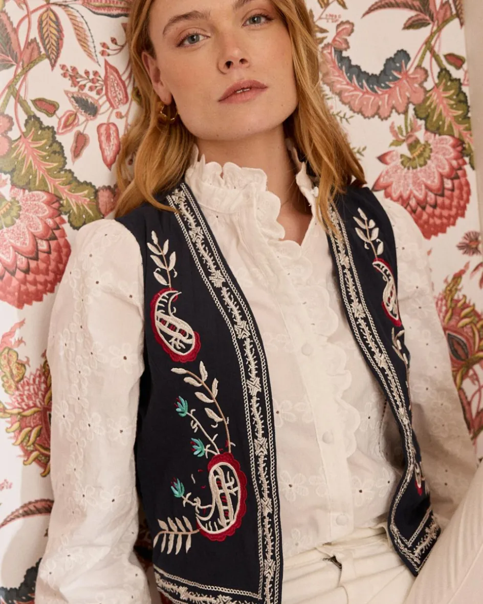 Gilet bleu marine avec détails brodés imprimés. Parfait pour rehausser vos looks de tous les jours.