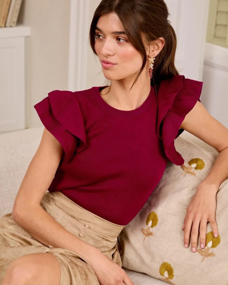 Top bougainvillier uni. Manches courtes avec détail à volants. Encolure ronde. Corps droit et réglable. Top pour lui donner une touche différente et se combiner dans la vie de tous les jours.