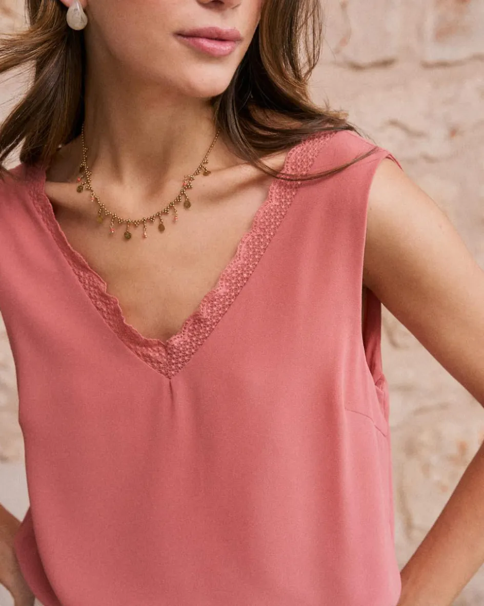 Haut en rose avec encolure en V ornée d’une délicate dentelle. Design sans manches et tombé fluide, idéal pour un look élégant et féminin.