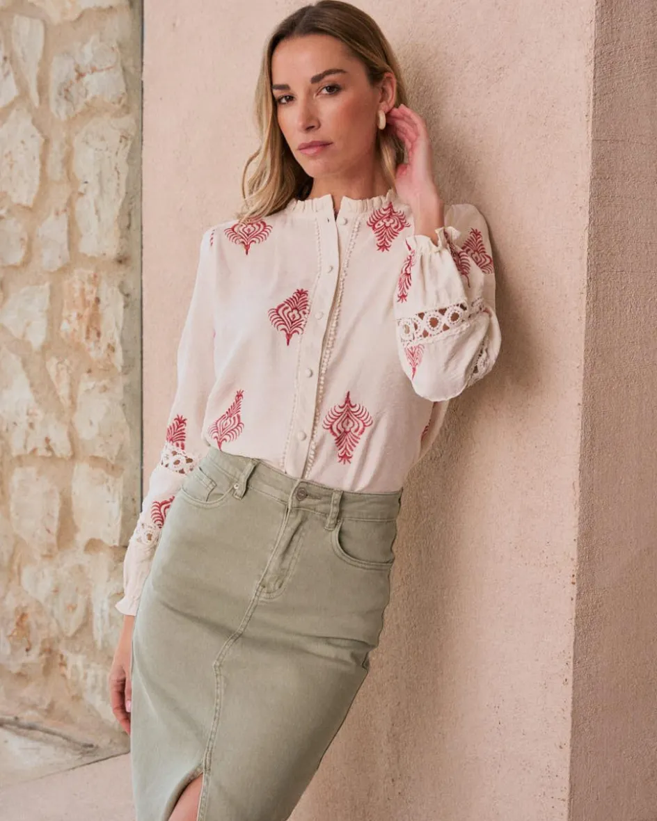 Chemise dans des tons bruts avec broderie rouge. Modèle à manches longues avec des détails ajourés sur les poignets, un col à volants subtil et des boutons sur le devant.
