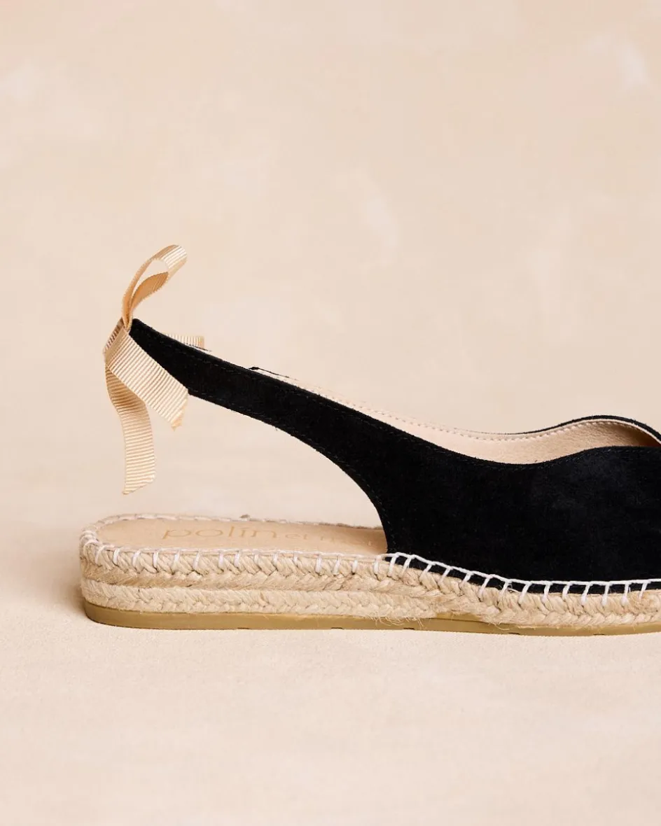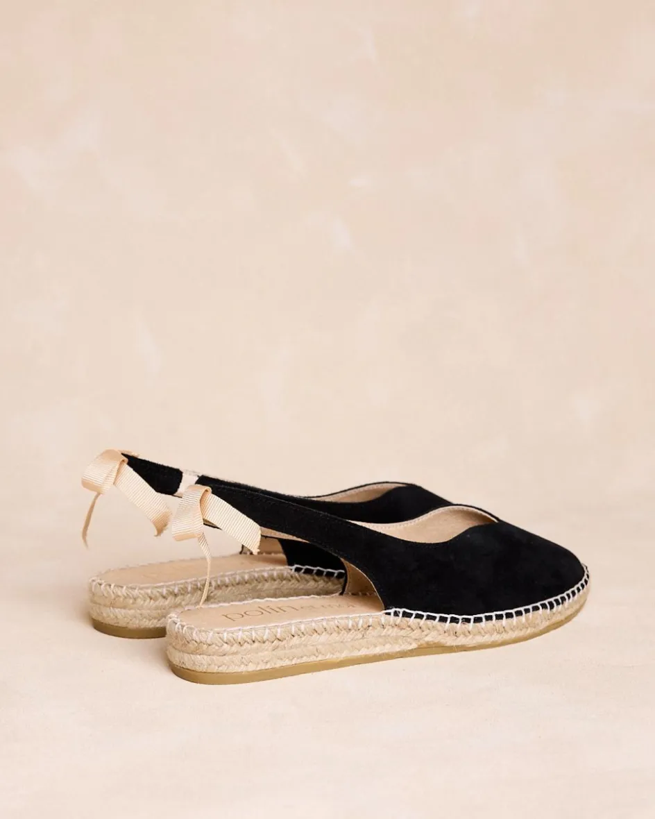 Espadrille plate en daim noir. Bout légèrement pointu. Encolure arrondie. Conception dos nu avec détail de nœud de couleur taupe. Fabrication espagnole de jute naturel. La semelle intérieure est dotée d’un coussinet pour plus de confort. Une espadrille confortable et féminine à porter au quotidien.