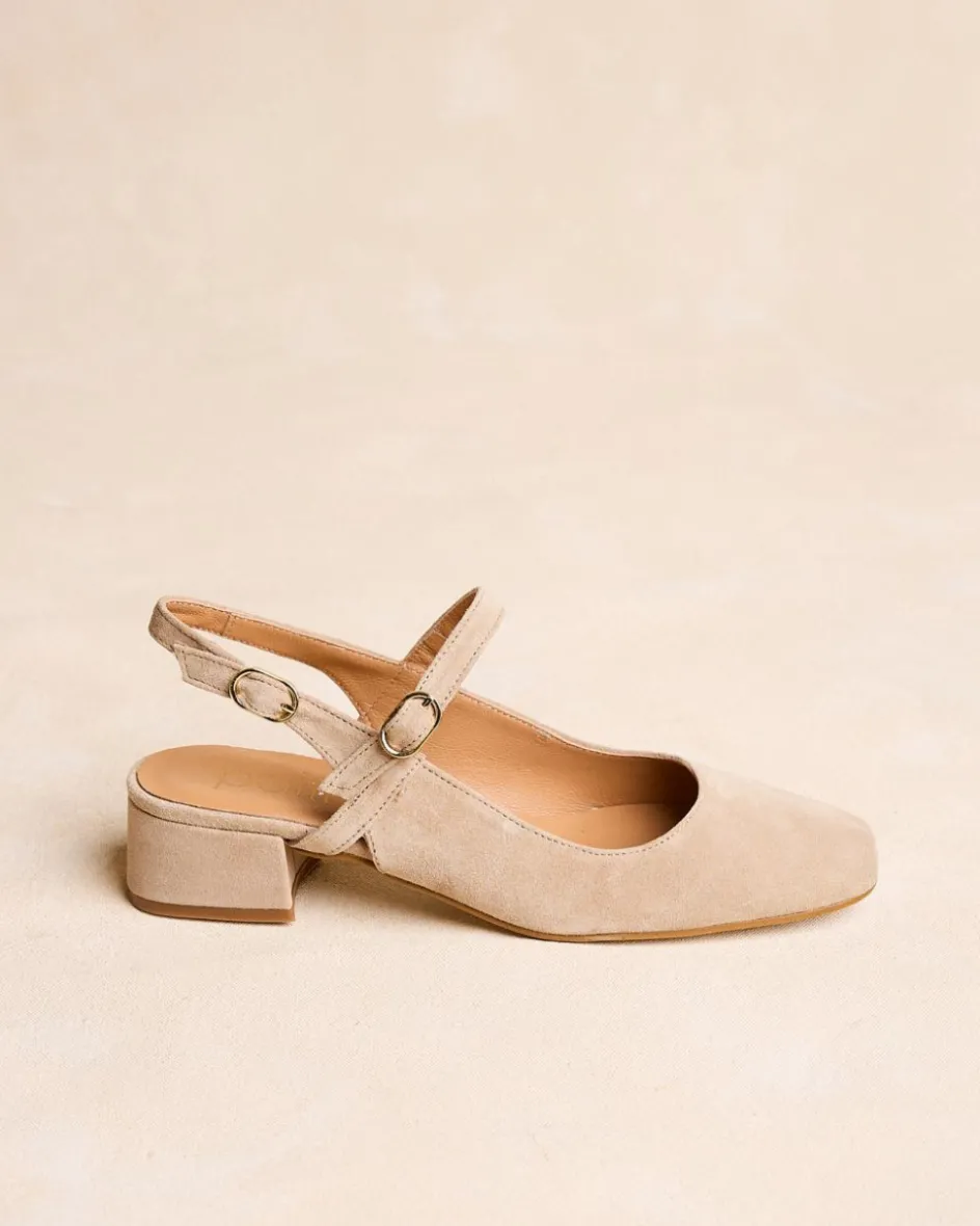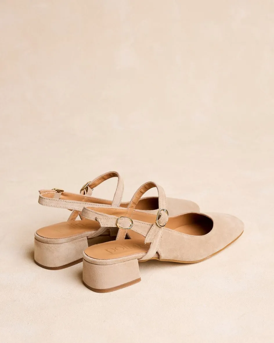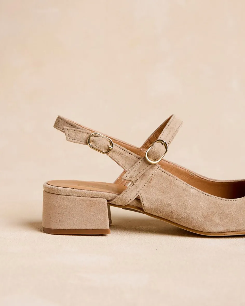 Ballerines escarpins arrière de couleur sable. Fermeture par sangle réglable avec boucles. Bout légèrement carré. Encolure arrondie.
